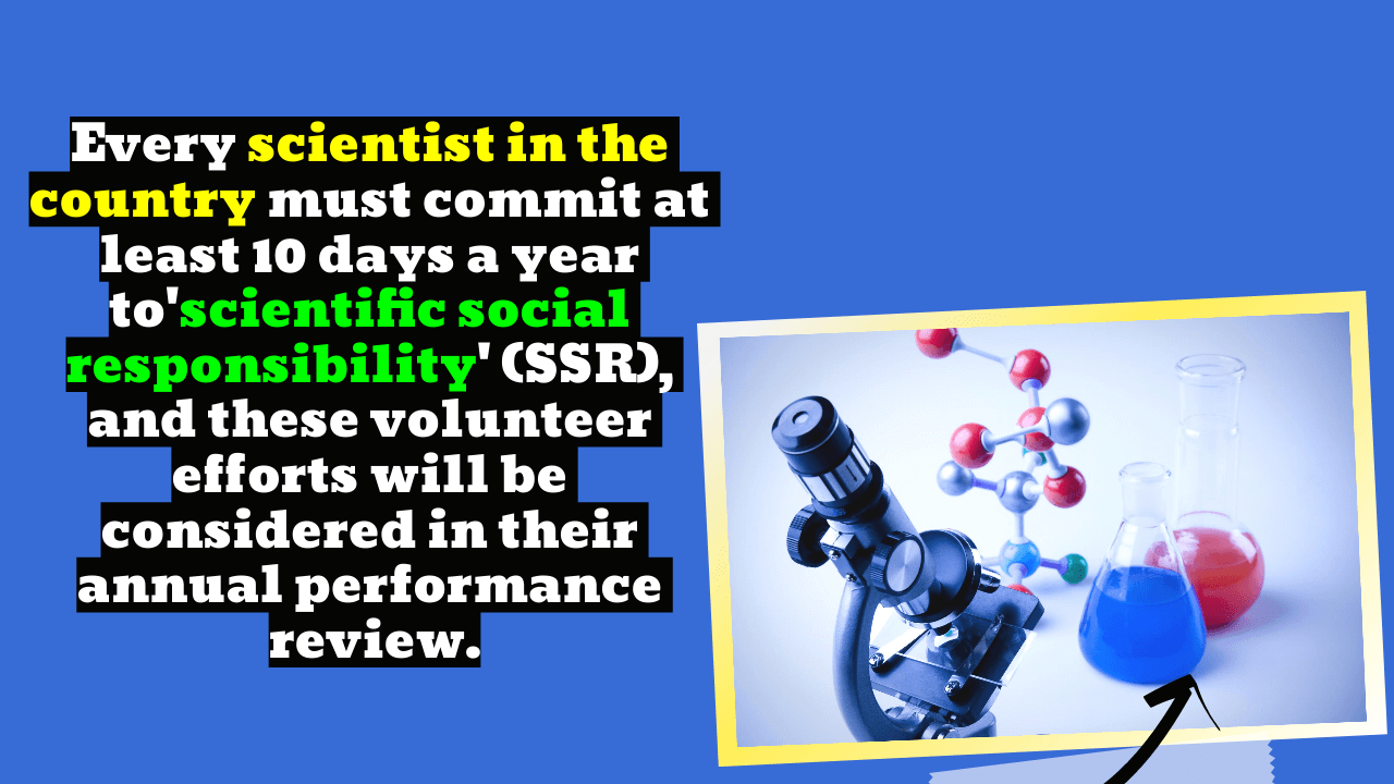 • Like CSR, SSR norms will affect scientist evaluations. Every scientist in the country is obliged to contribute at least 10 days a year to “scientific, social responsibility” (SSR), and such voluntary individual activities will be weighed in their annual performance review.