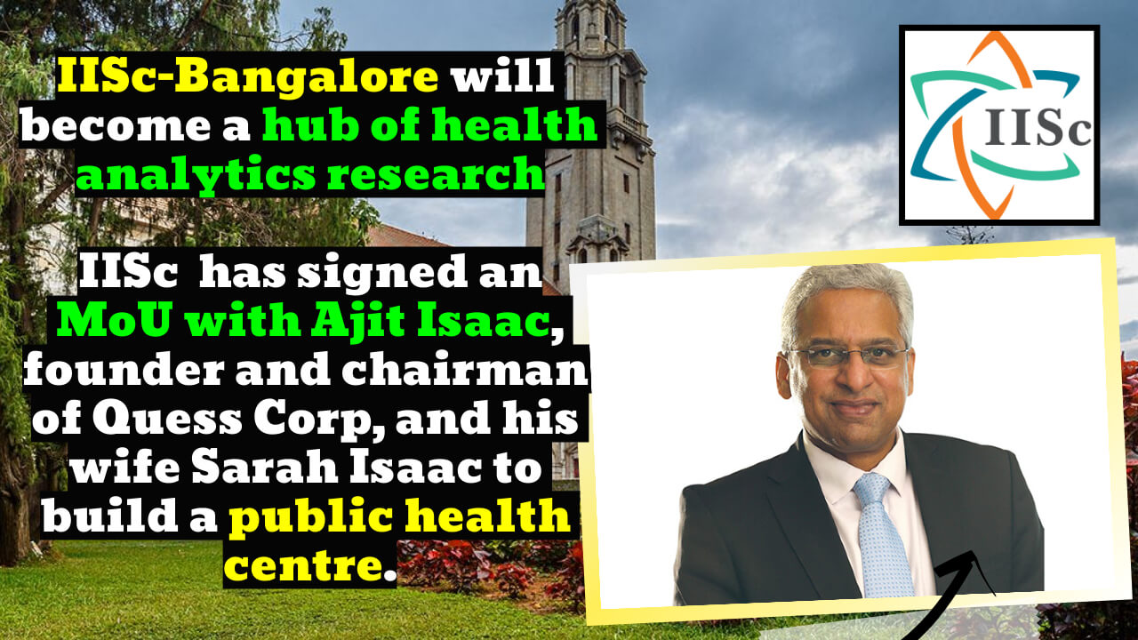 - To develop a hub for public health, IISC Bangalore has signed an MoU with Ajit Isaac, founder and chairman of Quess Corp.